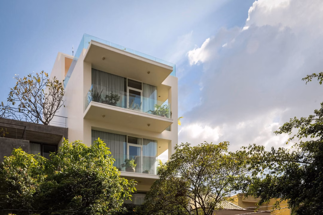 Khoảng sân xanh trước và sau nhà như những hơi thở mát lành, mời gọi nắng và gió lùa khắp không gian sống. Cây xanh được bố trí chiến lược, tạo bóng mát và giảm nhiệt độ môi trường nội thất.