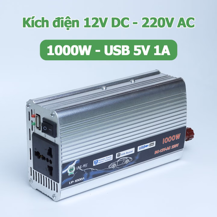 Bộ chuyển đổi điện Kích điện 1000W 12V DC sang 220V AC biến tần UP-1000A là một sản phẩm đáng chú ý. Sản phẩm này có công suất 1000W, có thể chuyển đổi điện áp từ 12V DC sang 220V AC, phù hợp cho nhiều loại thiết bị.