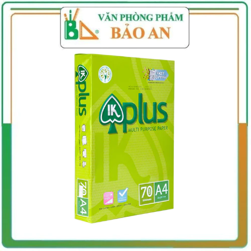- Giấy IK Plus A4: 70gsm, bề mặt láng mịn, độ trắng cao, giá thành hợp lý.
