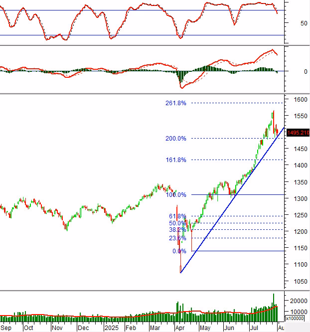 VN-Index hiện tại đang trong quá trình kiểm tra lại đường trendline tăng trung hạn, đồng thời đây cũng là vùng Fibonacci Projection 200% (tương đương 1,475-1,500 điểm), được xem là vùng hỗ trợ quan trọng trong ngắn hạn. Chỉ báo Stochastic Oscillator đã rời khỏi vùng quá mua (Overbought) sau khi phát tín hiệu bán, điều này làm tăng rủi ro điều chỉnh nếu chỉ số đánh mất vùng hỗ trợ này.